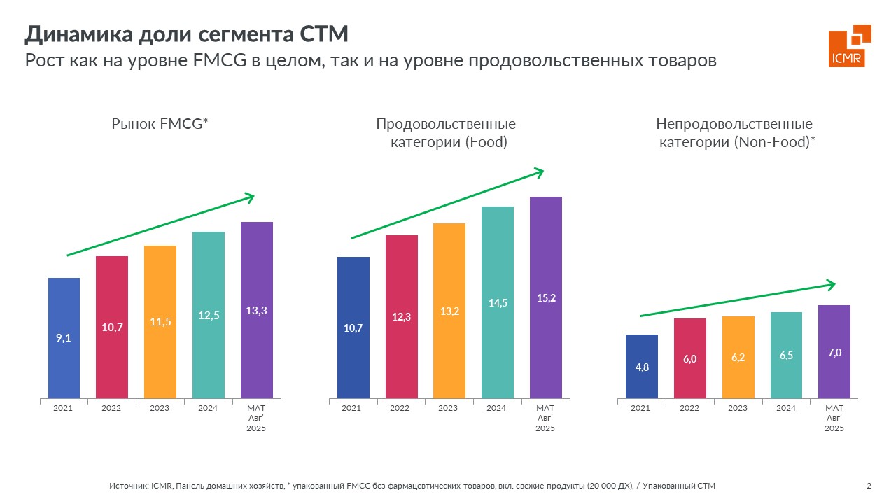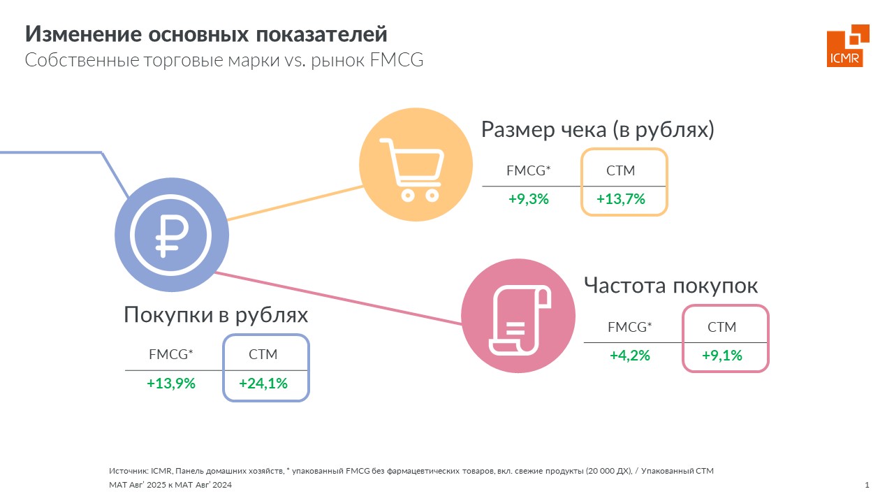 Собственные торговые марки (СТМ) продолжают укреплять свои позиции на российском рынке потребительских товаров (FMCG). В 2025 году этот сегмент демонстрирует значительный прирост продаж, опережая динамику всего рынка. Согласно исследованию данных Потребительской панели ICMR (ГФК-Русь), доля СТМ растет быстрее, чем общие показатели категории FMCG.